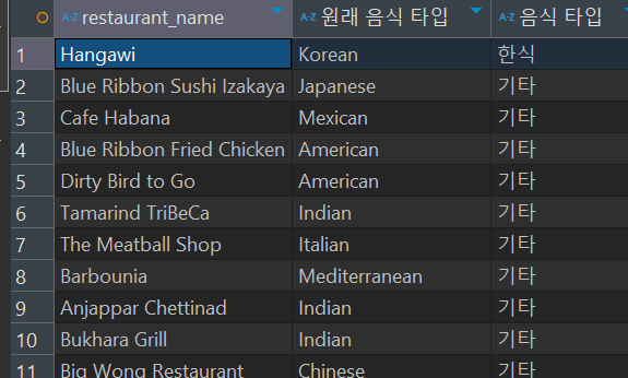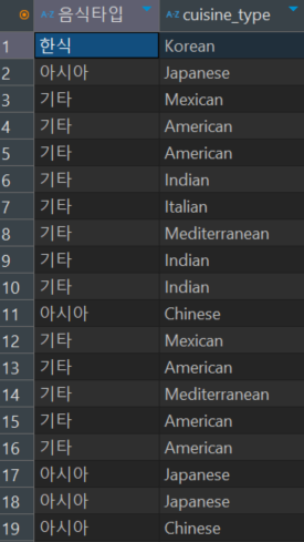 음식 타입을 ‘Korean’ 일 때는 ‘한식’, ‘Japanese’ 혹은 ‘Chienese’ 일 때는 ‘아시아’, 그 외에는 ‘기타’ 라고 지정