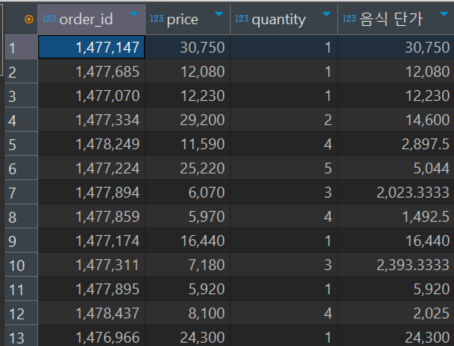 when quantity>=2 then price/quantity end "음식 단가"