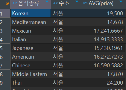 SELECT cuisine_type '음식종류',SUBSTR(addr,1,2) '주소', AVG(price)