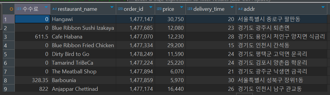 ELSE 0 END "수수료",restaurant_name, order_id,price,delivery_time,addr