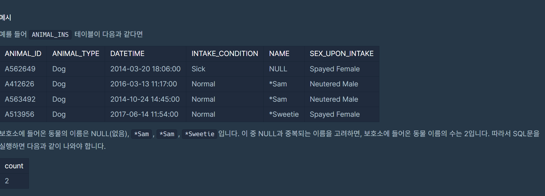 WHERE INTAKE_CONDITION='Sick'